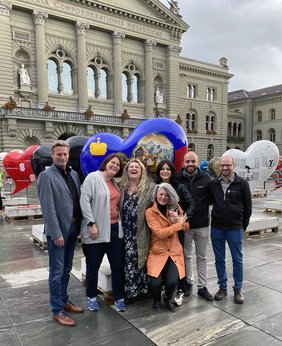Herzhaft lachend und glücklich versammelt auf dem Bundesplatz in Bern. Die Liechtensteiner Herz-Delegation sowie die beiden Initiantinnen von links nach rechts: Christian Hausmann (Vorsitzender der Geschäftsleitung HPZ), Ines Sturzenegger (Leiterin Atelier HPZ), Carolina Caroli (Initiantin HeartBeats), Jacqueline Frei (unten, Leiterin Marketing & Vertrieb KYBERNA AG, Claudia Knie (oben, Initiantin HeartBeats), David Cohen (Projektleiter Marketing & Kommunikation KYBERNA AG), Tobias Schönberg (Softwareentwickler Online-Auktion KYBERNA AG).